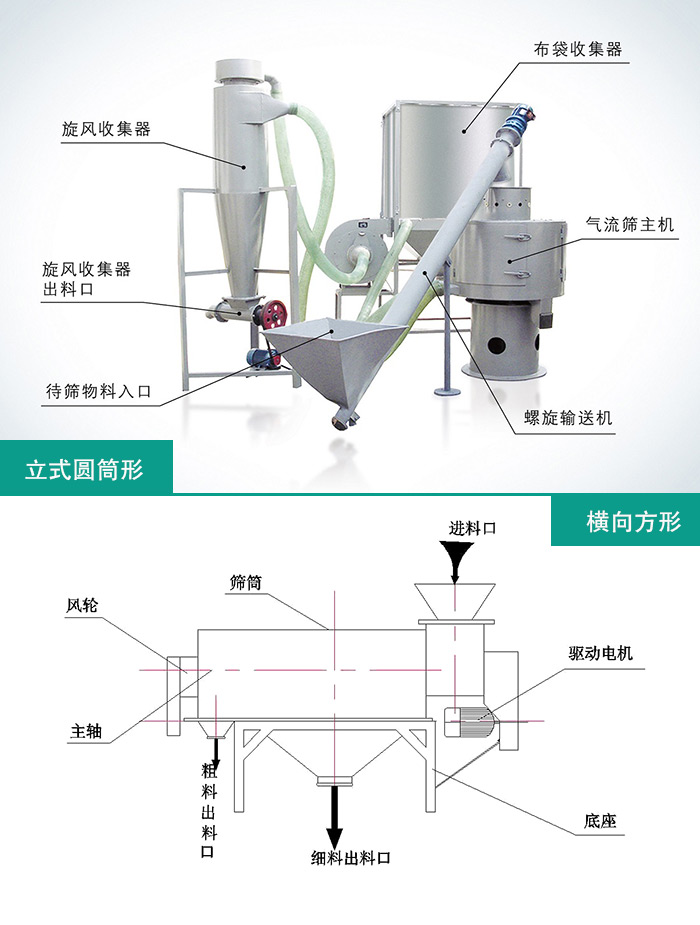 回答:有兩種設(shè)計(jì)形式,①立式氣流篩②臥式氣流篩