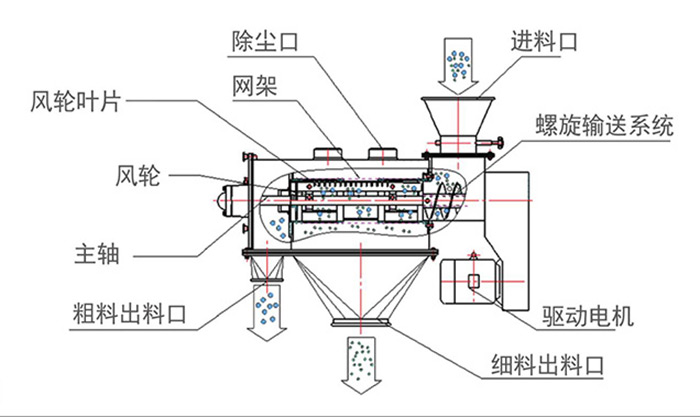 臥式氣流篩:臥式氣流篩分機(jī)篩網(wǎng)為圓筒狀,置于機(jī)體內(nèi),物料通過(guò)螺旋輸送系統(tǒng)后,和氣流混合、霧化進(jìn)入網(wǎng)筒內(nèi);通過(guò)網(wǎng)筒內(nèi)風(fēng)輪葉片使物料同時(shí)受離心力和旋風(fēng)推進(jìn)力,從而近使物料噴射過(guò)網(wǎng),由細(xì)料排出口排出,不能過(guò)網(wǎng)的物料沿網(wǎng)筒壁從粗料排出口排出。