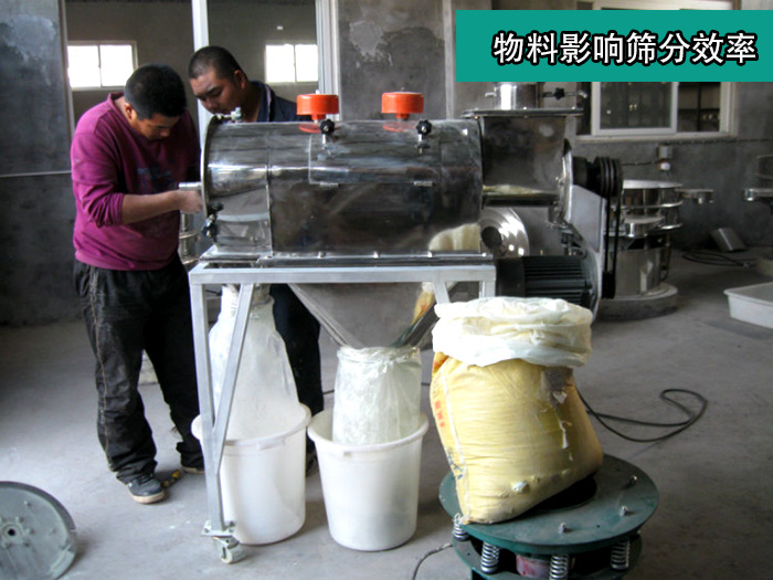 礦料的顆粒度要嚴(yán)格控制在臥式氣流篩的技術(shù)參數(shù)范圍以內(nèi),顆粒度指數(shù)差異過(guò)大,就會(huì)造成生產(chǎn)循環(huán)大,制約產(chǎn)品的質(zhì)量和處理能力。物料在篩分過(guò)程中的透篩概率受很多因索影響,其中自接和重要的因索是物料粒度與篩孔尺寸的相又寸大;物料顆粒組成:為了提高篩分效率, 要在被篩分物料級(jí)配組成確定的情況下, 確定臥式氣流篩篩孔尺寸, 使難篩物料( 粒徑為 0.7~1倍篩孔尺寸的物料) 占應(yīng)篩下物料的比例小。