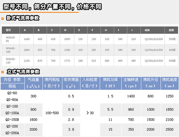 氣流篩分機(jī)型號(hào)分為多種,LQS-600,LQS-1000,LQS-1600,WQS18-65,WQS30-100,WQS50-130等,型號(hào)不同,電機(jī)功率不同,所以氣流篩的篩分效率也存在差異,以此類(lèi)推,價(jià)格也會(huì)受到相應(yīng)的影響,就會(huì)出現(xiàn)有高價(jià)有低價(jià)